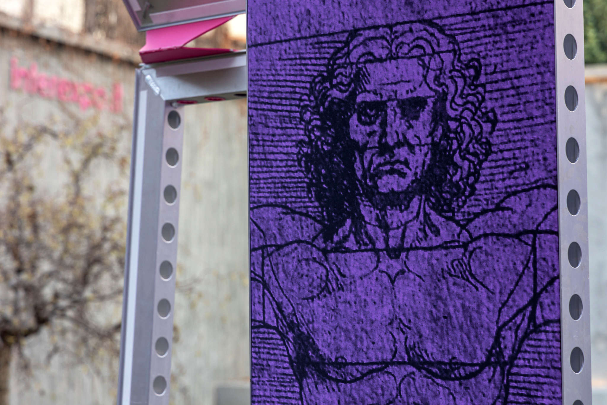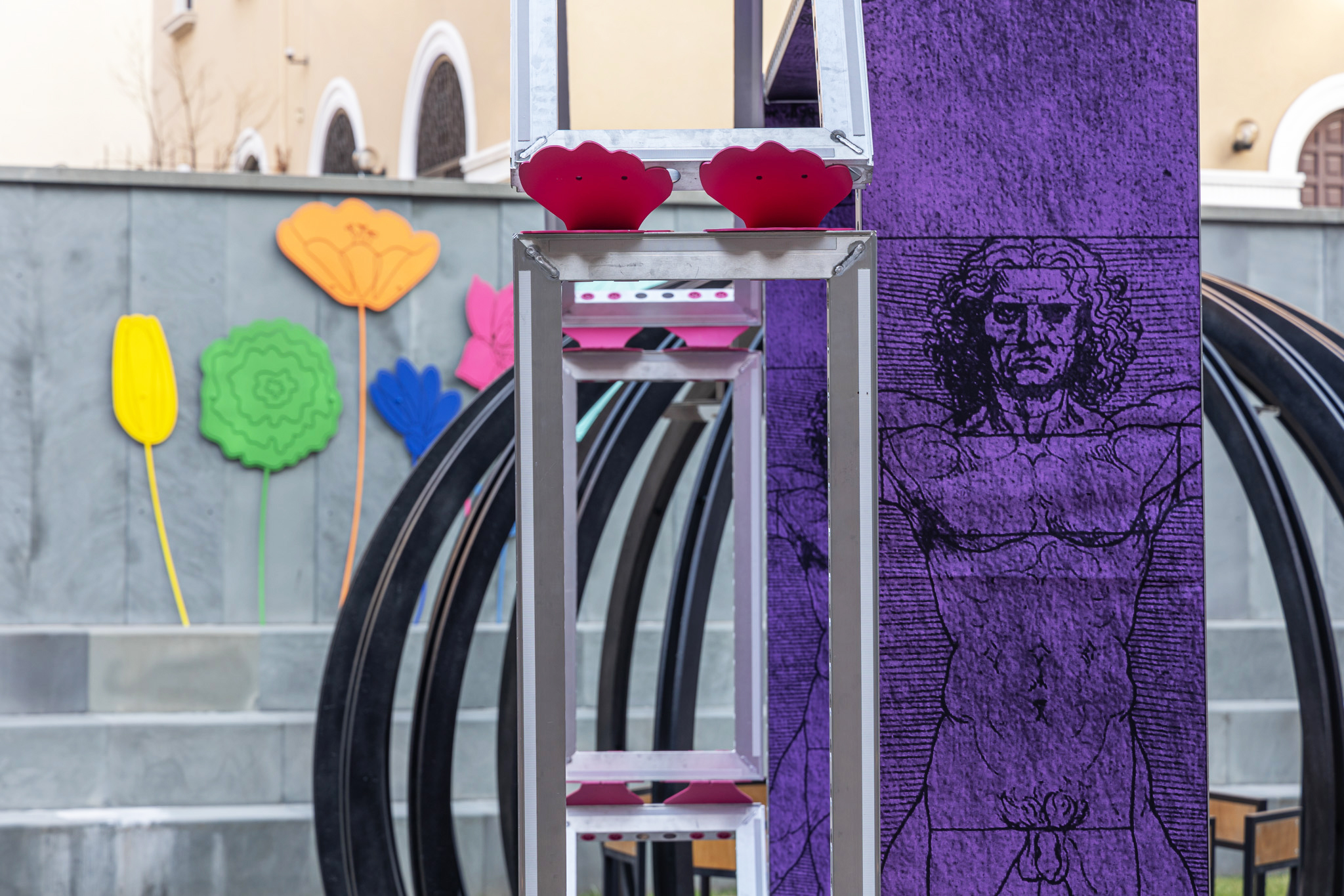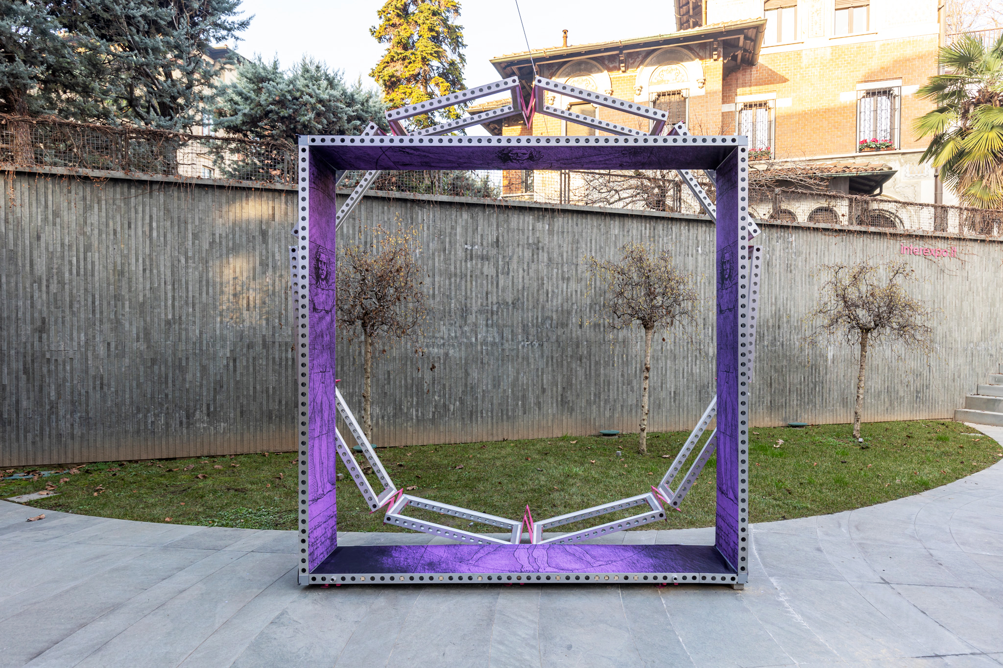Genesis is a ring-shaped element reproducing Leonardo da Vinci’s famous Vitruvian Man. Its structure is made entirely of beMatrix aluminium frames, covered in dye-sublimation print fabric. This installation has been designed to actively involve visitors, who can enter the ring and step into the shoes of the Vitruvian Man.